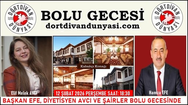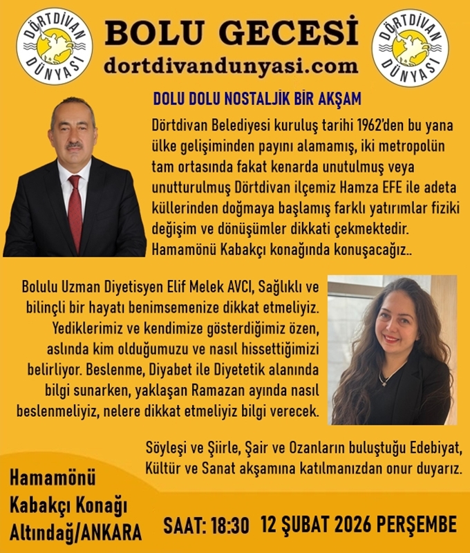 Ankara Altındağ Hacettepe Hamamönü Kabakçı Konağında 12 Şubat 2026 Perşembe günü akşamı saat: 18:30 ile 21:00 arasında Dörtdivan Belediye Başkanı Hamza EFE ve Uzman Diyetisyen Elif Melek AVCI hitap ederken; Akabinde Şair ve Ozanlarımız tarafından yüreklerinden satırlara dökülen şiirleri ve ozanlarımızın nağmeleri yer alacak. Bu önemli tarihi geceye tüm sanat severler ve hemşehrilerimiz davetlidir.