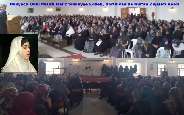Çocuk yaşlardan beri sesinin güzelliği ile tanınan Mısırlı Hafız Sümeyye Eddeb, Dörtdivan Belediyesi Kültür Merkezi’ni dolduran Dörtdivanlı kadınlara Kur’an-ı Kerim ziyafeti verdi. Okuduğu Kur’an-ı Kerim ve kasidelerle gönüllerin pasını silen Sümeyye Eddeb’in sesinin güzelliği tüm bayanları büyüledi.