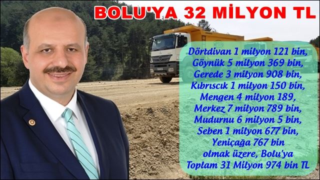 Milletvekili Ercoşkun, yatırım rekorunu oluşturan rakamın ilçelere dağılımını ise, şöyle açıkladı: "Dörtdivan 1 milyon 121 bin, Göynük 5 milyon 369 bin, Gerede 3 milyon 908 bin, Kıbrıscık 1 milyon 150 bin, Mengen 4 milyon 189, Merkez 7 milyon 789 bin, Mudurnu 6 milyon 5 bin, Seben 1 milyon 677 bin, Yeniçağa 767 bin olmak üzere, Bolu'ya toplam 31 milyon 974 bin TL KÖYDES ödeneği sağladık."