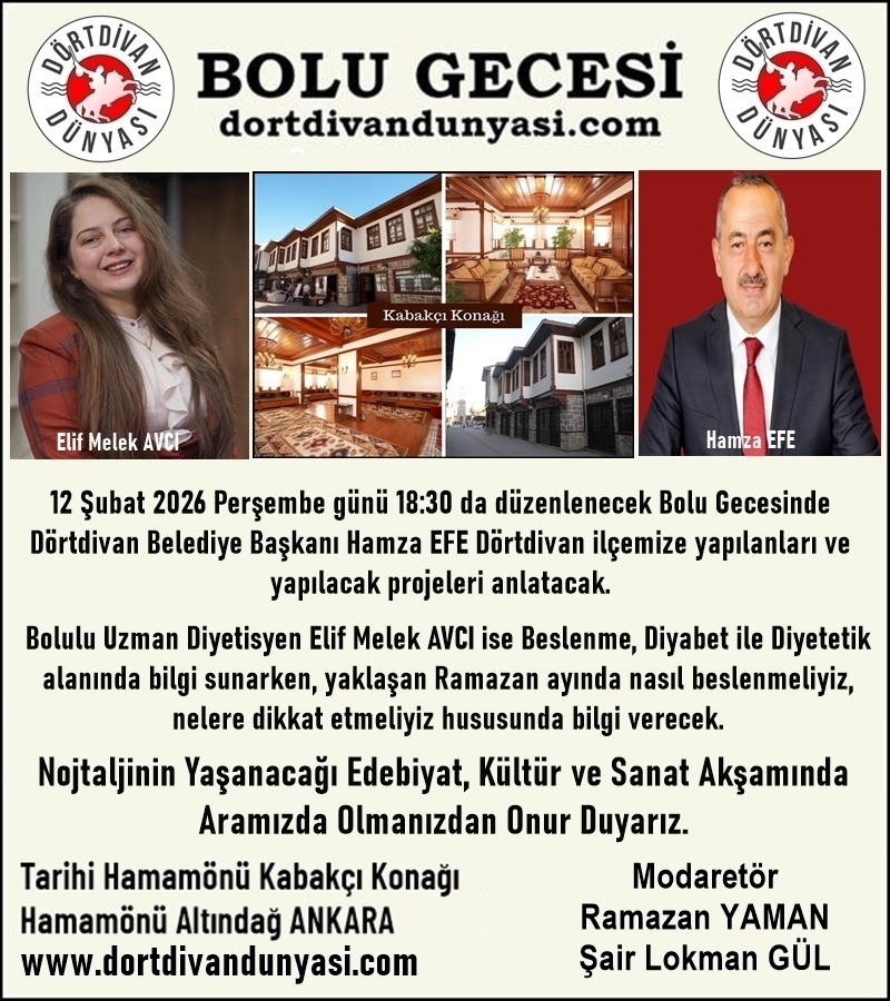 Ankara Altındağ Hacettepe Hamamönü Kabakçı Konağında 12 Şubat 2026 Perşembe günü akşamı saat: 18:30 ile 21:00 arasında Dörtdivan Belediye Başkanı Hamza EFE ve Uzman Diyetisyen Elif Melek AVCI hitap ederken; Akabinde Şair ve Ozanlarımız tarafından yüreklerinden satırlara dökülen şiirleri ve ozanlarımızın nağmeleri yer alacak. Bu önemli tarihi geceye tüm sanat severler ve hemşehrilerimiz davetlidir.
