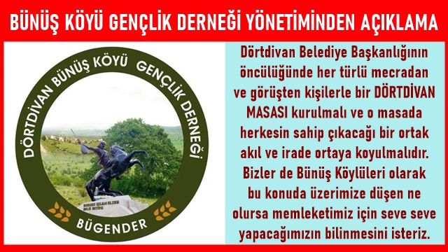 Bu konuda Dörtdivan’ın önde gelenlerini göreve davet ediyoruz. Başta siyasetin içinde olanların bir an önce küskünlüklerini ve kişisel çıkarlarını bir kenara koyarak bir araya gelmeleri gerekmektedir. Dörtdivan Belediye Başkanlığının öncülüğünde her türlü mecradan ve görüşten kişilerle bir DÖRTDİVAN MASASI kurulmalı ve o masada herkesin sahip çıkacağı bir ortak akıl ve irade ortaya koyulmalıdır.